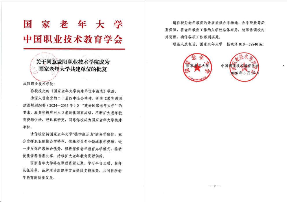 近日,国家老年大学、中国职业技术教育学会联合印发《关于同意咸阳职业技术学院成为国家老年大学共建单位的批复》,正式批准咸阳职业技术学院成为国家老年大学共建单位。这是学院深入贯彻落实积极应对人口老龄化国家战略、推进终身教育体系建设的重大标志性成果,标志着学院老年教育事业正式纳入国家级发展平台,迈入高质量发展新阶段。
