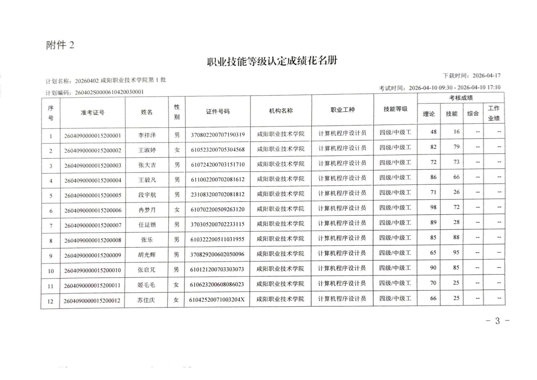2026年第一批职业技能等级认定成绩公示